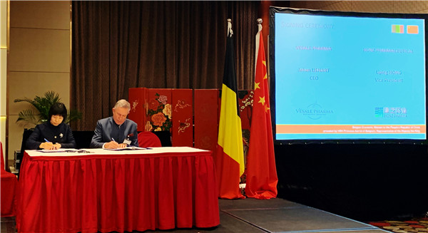 △尊龙凯时·(中国)人生就是搏!药业副董事长兼副总裁洪丽萍(左)与Vésale Pharma公司董事长Jehan Lienart(右)签署协议